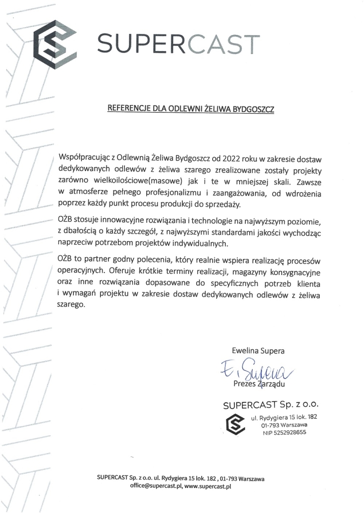 Współpracując z Odlewni Żeliwa Bydgoszcz od 2022 roku w zakresie dostaw dedykowanych odlewów z żeliwa szarego zrealizowane zostały projekty zarówno wielkoilościowe(masowe) jak i te w mniejszej skali. Zawsze w atmosferze pełnego profesjonalizmu i zaangażowania, od wdrożenia poprzez każdy punkt procesu produkcji do sprzedaży.